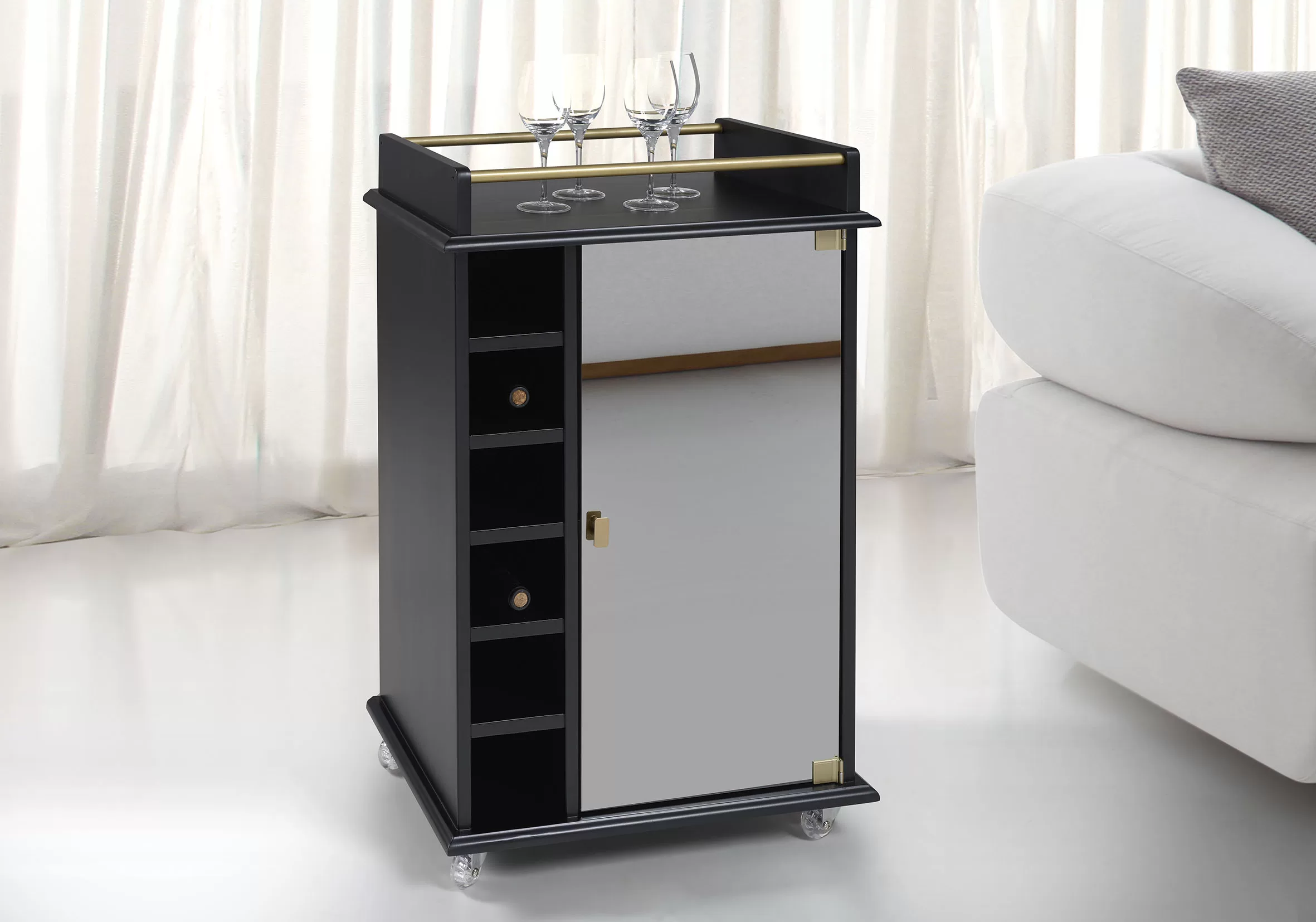 Esse barzinho se destaca por sua porta em vidro reflecta, que adiciona leveza visual e traz a sensação de amplitude ao ambiente. Por isso, ele é ideal para salas de estar, varandas gourmet e até escritórios. Assim, você pode receber convidados com muito mais estilo.