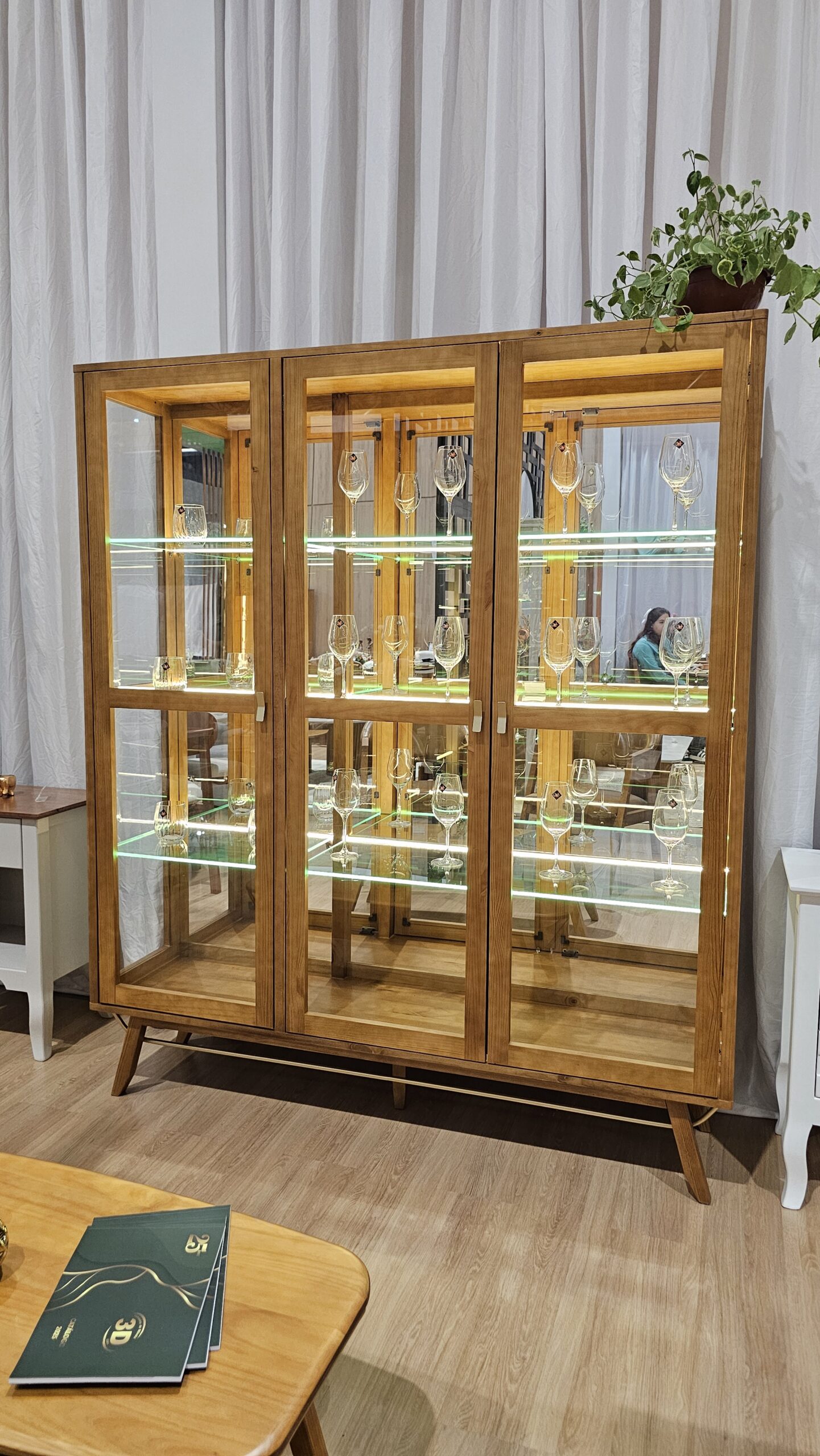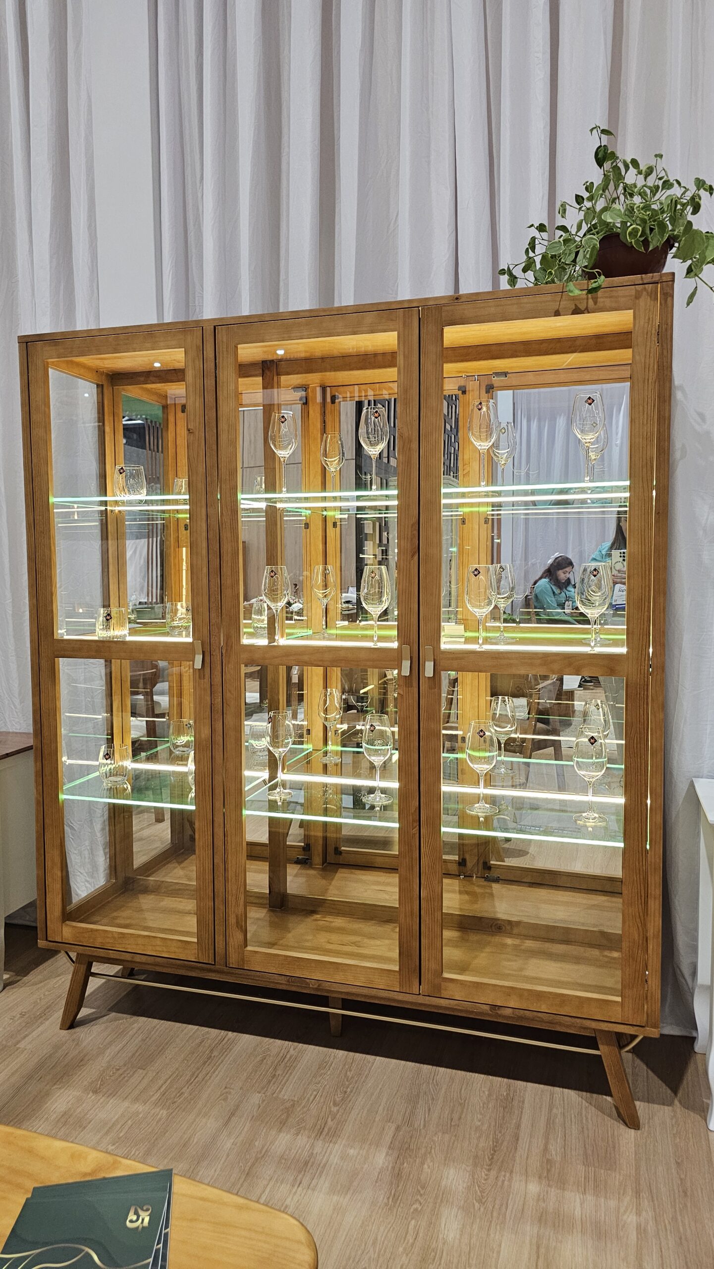 - Material predominante: estrutura com painéis de madeira e portas/prateleiras em vidro