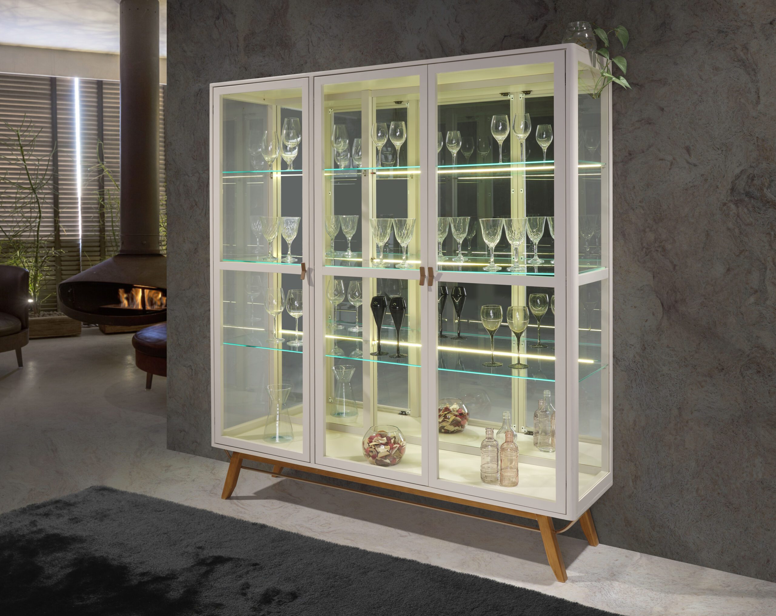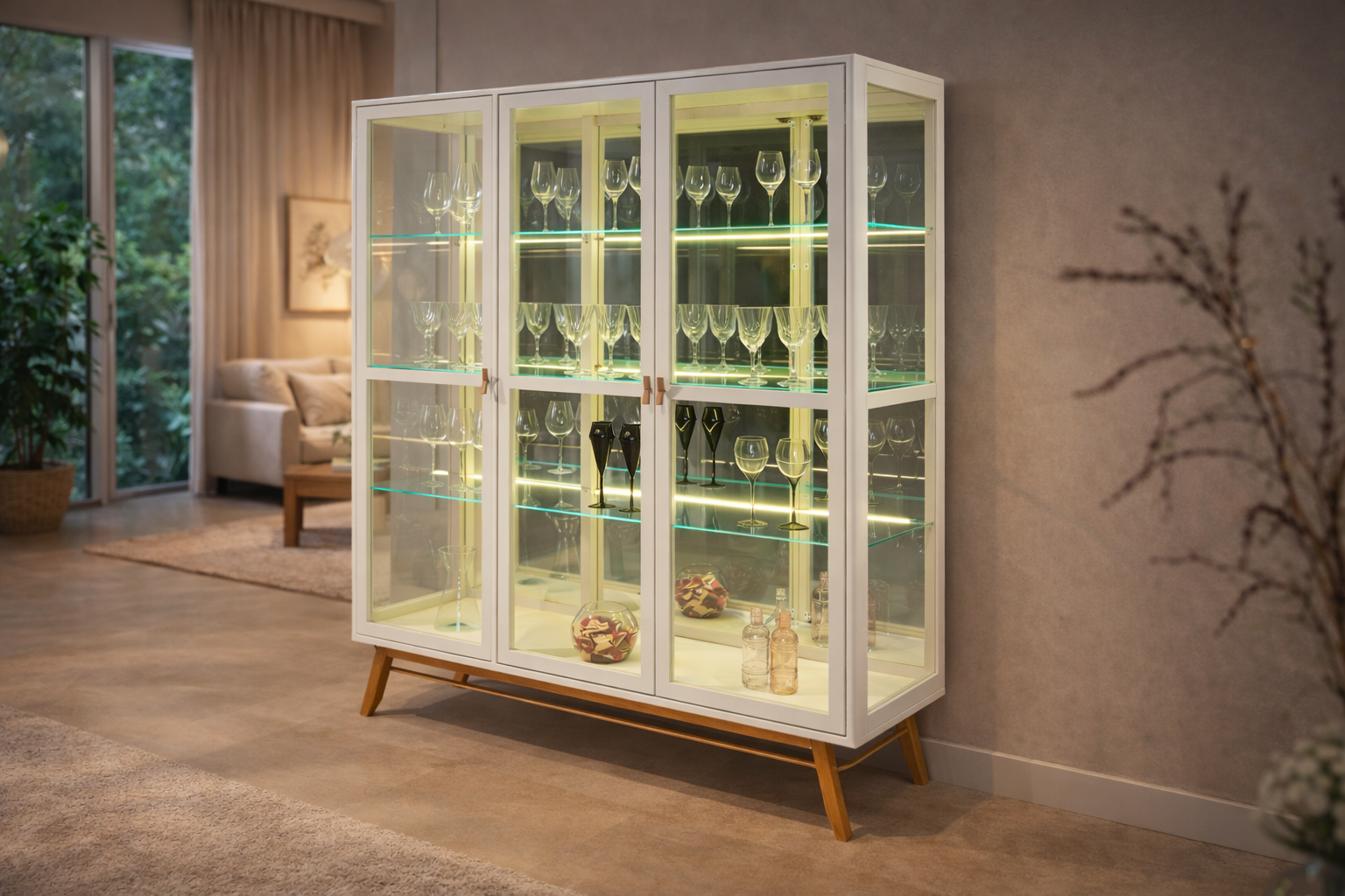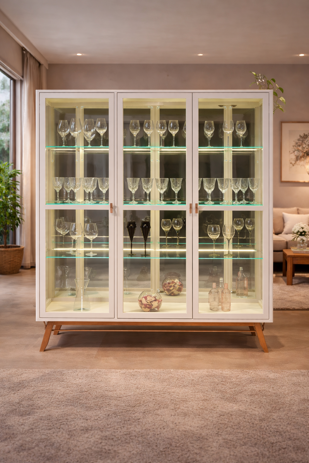 A Cristaleira Florence 3 Portas combina linhas limpas, portas em vidro e iluminação interna, criando um cenário elegante para taças, copos e itens decorativos. O visual leve valoriza diferentes estilos de decoração, do contemporâneo ao clássico.