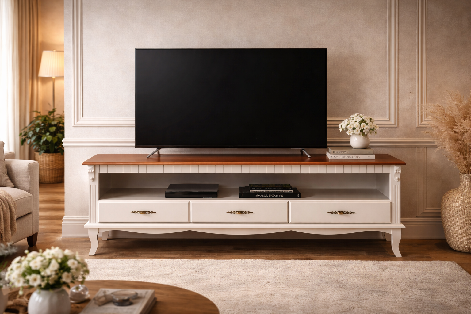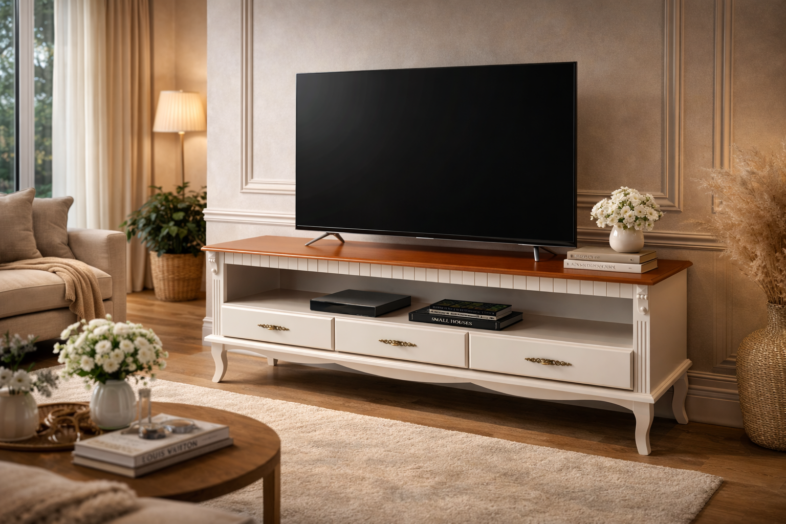 Possui 3 gavetas com corrediças suaves, perfeitas para organizar controles, manuais e acessórios, além de um nicho amplo para eletrônicos e decoração. A estrutura robusta garante durabilidade, enquanto seu estilo atemporal valoriza qualquer ambiente.